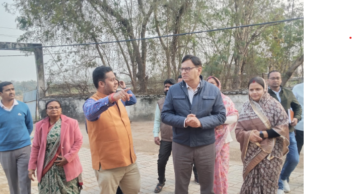 एक बाहरी दृश्य है जहाँ अधिकारियों और जनप्रतिनिधियों का एक समूह निरीक्षण के लिए एकत्र हुआ है। केंद्र में नारंगी रंग की हाफ-जैकेट पहने एक व्यक्ति हाथ से किसी दिशा की ओर इशारा करते हुए कुछ समझा रहा है। उनके बगल में गहरे नीले रंग की जैकेट पहने एक अन्य वरिष्ठ व्यक्ति ध्यान से सुन रहे हैं। समूह में दो महिलाएँ भी शामिल हैं, जिनमें से एक ने प्रिंटेड साड़ी और शॉल पहनी है। पृष्ठभूमि में एक पुरानी दीवार, कुछ पेड़ और बिजली के तार दिखाई दे रहे हैं। यह दृश्य किसी विकास कार्य या सरकारी परियोजना के जमीनी निरीक्षण को दर्शाता है